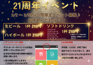 【祝・21周年】4日間限定!感謝の「ドリンク210円」特別イベント開催のお知らせ